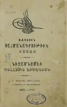 الدستور الوطني الأرمني ( بالأرمينية : Հայ ազգային սահմանադրութիւն) في 1863 وافقت الإمبراطورية العثمانية على تشكل "قانون اللوائح" المؤلف من 150 مادة، المواد صيغت من قبل الأرمن المثقفين والتي تحدد صلاحيات البطريرك والجمعية الوطنية الأرمنية التي تشكلت حديثًا. ما زال هذا القانون نشطًا بين الكنيسة الأرمنية في الشتات.