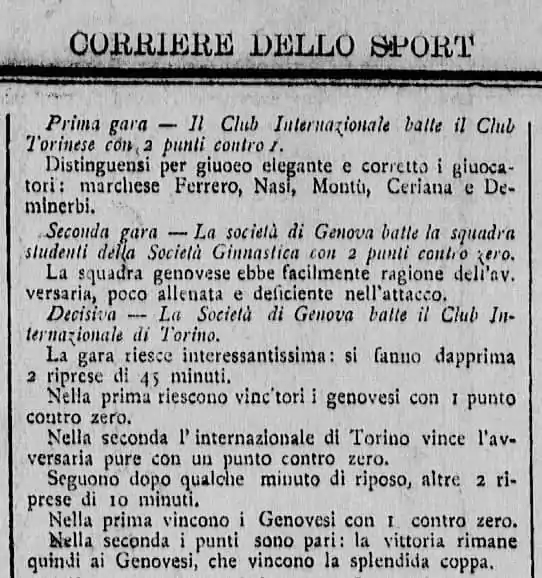 |CitationClass=تم تجاهله (مساعدة) - "Accadde oggi: 120 anni fa il primo campionato di calcio in Italia, vinse il Genoa | Sky Sport". sport.sky.it. مؤرشف من الأصل في 02 فبراير 2021. اطلع عليه بتاريخ 25 فبراير 2021. الوسيط