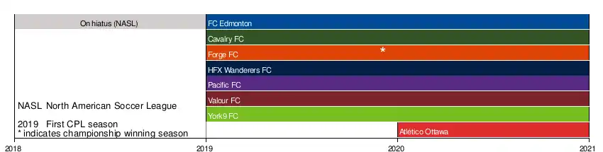 تم الكشف عن الفريق الأول، يورك ناين أف سي، في 10 مايو، بمشاركة المالكين جيم برينان وبريبن غانزهورن ببيرن وكلاناشان. تبع ذلك فريق كافالري أف سي الذي يتخذ من كالجاري مقراً له في 17 مايو 2018 ، و آيتش أف إكس واندرز من نادي هاليفاكس في 25 مايو[14][15]، ثم أف سي فالور في وينيبيغ في 6 يونيو[16][17]، ثم أعيد تشكيل فريق نورث أمريكا سوكر ليغ السابق مع فريق أف سي إيدموند في 8 يونيو.[18][19] كأس العالم 2018، كان هاميلتون فورج إف سي هو الكشف التالي في 12 يوليو، يليه باسفيك لانجفورد في جزيرة فانكوفر في 20 يوليو.[20]