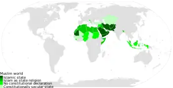 اليوم أدمجت العديد من الدول الإسلامية الشريعة الإسلامية جزئيًا، في أنظمتها القانونية. أعلنت بعض الدول الإسلامية أن الإسلام دين الدولة في دساتيرها، لكن لا تطبق الشريعة الإسلامية في محاكمها. يشار عادةً إلى الدول الإسلامية التي ليست ملكية إسلامية باسم الجمهوريات الإسلامية،[10] مثل الجمهوريات الإسلامية في باكستان وموريتانيا وإيران[11] وأفغانستان.[12] اعتمدت باكستان اللقب بموجب دستور عام 1956. تبنته موريتانيا في 28 نوفمبر 1958. وقد تبنته إيران بعد ثورة 1979 التي أطاحت بأسرة بهلوي. في إيران يُعرف نظام الحكم باسم " ولاية الفقيه ". كانت أفغانستان تدار كدولة إسلامية (" دولة أفغانستان الإسلامية ") في فترة ما بعد الشيوعية منذ عام 1992 ولكن بعد ذلك بحكم الواقع من قبل طالبان (" إمارة أفغانستان الإسلامية ") في المناطق التي تسيطر عليها منذ عام 1996 وبعد عام 2001 وبعد الإطاحة بنظام طالبان ما زالت البلاد تعرف باسم "جمهورية أفغانستان الإسلامية". على الرغم من الاسم المماثل تختلف البلدان اختلافًا كبيرًا في حكوماتها وقوانينها.