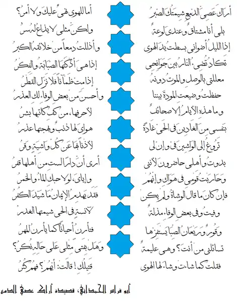 |CitationClass=تم تجاهله (مساعدة) - El Tayib, Abdullah (1990). "Abū Firās al-Ḥamdānī". In Ashtiany, Julia; Johnstone, T. M.; Latham, J. D.; Serjeant, R. B.; Smith, G. Rex (المحررون). ʿAbbasid Belles-Lettres. Cambridge: Cambridge University Press. صفحة 326. ISBN 0-521-24016-6. الوسيط