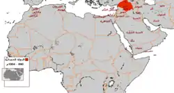 ![]() خارطة تُظهر حُدود الدولة الحمدانيَّة ضمن الحُدود السياسيَّة المُعاصرة للوطن العربي | |||||||||