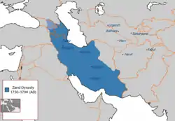 ينحدر الزند من إحدى القبائل الكردية الفيلية التي استوطنت منطق جنوب إيران. سنة 1731 م قام نادر شاه بطردهم من مناطقهم إلى خراسان . عاد الزند مجددا إلى منطقة الجنوب يقودهم كريم خان زند . استولى كريم خان (1750- 1779 م) على مناطق جنوب إيران ثم تلقب بالوكيل . بعد فتح مازندران (1759 م) ثم أذربيجان ( 1762 م ) أصبح يملك مناطق واسعة في إيران باستثناء منطقة خراسان، وحاصر البصرة حتى خرج أعيانها إلى القائد صادق خان وطلبوا منه الأمان، ولكنه دخلها فأباحها أياماً وعمل فيها من الهتك ما لم يُسمع به في ملة قطّ، وسُبّ أصحاب محمد على المنابر.[1] وفي هذه الفترة برز القائد محمد خان الزندي الذي حافظ على حدود إيران الغربية وهزم الجيش العثماني في معركة واجبر قائد الجيش العثماني على الانسحاب إلى كركوك ولم يستطع القائد اتركي بعدها على مواصلة حربه وارغم على الرجوع إلى مقره في جولان . قاد دولته إلى أوجها الاقتصادي ( ازدهار التجارة مع الهند ، التحكم في مداخيل الضرائب، تطوير نظام الري) كما جعل من عاصمته ( شيراز ) مركزا ثقافيا مهما . بعد وفاته دخلت البلاد في حالة فوضى . استمرت الحروب حتى سقوط آخر الزند سنة 1794 م في كرمان على يد القاجار ، والذين خلفوهم في إيران.