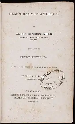 Democracy in America De la démocratie en Amérique ![]() Title page of Democracy in America by Alexis de Tocqueville, printed at نيويورك, 1838