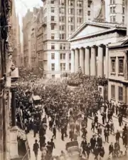 | الذعر المصرفي (اندفاع على المصارف لسحب الودائع) يجبر شركة نيكربوكر على تعليق جميع عمليات التداول على أسهمها. | |