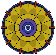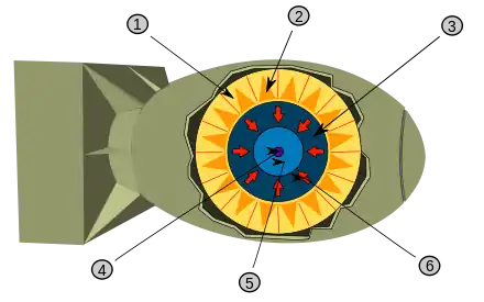 مقطع للقلب يظهر الهيكل الهندسي لطبقات المتفجرات. الواضح أنها وضعت بدقة عالية لتركيز القوى نحو المركز.