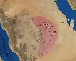 يتفق الباحثون أن جزيرة العرب هي الموطن الأول للساميين (أي أبناء سام بن نوح)، وأن منطقة نجد هي الموطن الأول للجنس السامي. ومنها انطلقت الهجرات السامية القديمة إلى أطراف الجزيرة العربية؛ حيث أن أرض نجد كانت في السابق أكثر صلاحية للسكن والاستقرار من حيث خصوبة الأرض ووفرة المياه، وعندما تغيرت الظروف المناخية وجفت المياه، خرجت موجات من السكان إلى المناطق المجاورة في بلاد ما بين النهرين والشام واليمن. وأقدم هذه الهجرات ترجع إلى الألف الخامس قبل الميلاد.[43] وكانت قبيلتا طسم وجديس البائدتين تستوطنان إقليم اليمامة (نجد)، ويختلف المؤرخون في أصول هاتين القبيلتين، القول الأول أنهم من سلالة سام بن نوح مع اختلاف كل مؤرخ في سلسلة نسبهما. وأحد الأقوال أن قبيلة طسم هي التي ورد ذكرها في التوراة باسم "لطوشيم" من دادان بن يقشان، ويرى بعض المستشرقين أن اسم "Jodisite" أو "Jodisit" الوارد ذكره في جغرافية بطليموس هو اسم قبيلة من قبائل شرق الجزيرة العربية، وأنها قبيلة جديس. وأنها كانت موجودة حوالي 125م. ويوجد شبه اتفاق بين المؤرخين أن موطن القبيلتين هو اليمامة، وكانت طسم في الجزء الشمالي من اليمامة (الرياض)، وكان موطن جديس في جنوب اليمامة (جو الخضارم).[44]