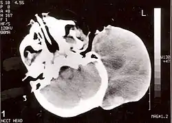 ![]() ساركومة عضلية مخططة سنخية خُلقية خلف صيوان الأذن، تَظهر بالتصوير المقطعي غير المتباين للرأس الذي يُظِهر كتلة كبيرة دون أي امتداد داخل الجمجمة. ساركومة عضلية مخططة سنخية خُلقية خلف صيوان الأذن، تَظهر بالتصوير المقطعي غير المتباين للرأس الذي يُظِهر كتلة كبيرة دون أي امتداد داخل الجمجمة. | |