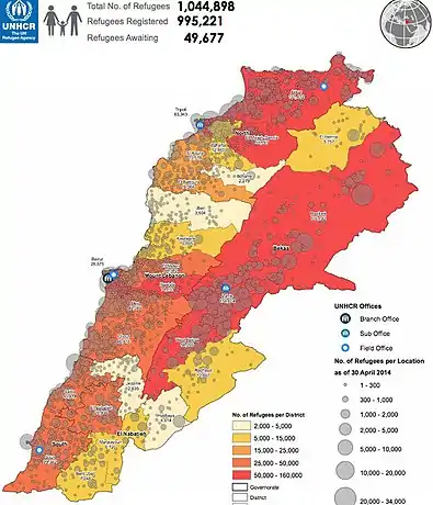 بالنظر إلى عدد سكان لبنان المقدر بنحو 5.9 مليون فإن 1.5 مليون لاجئ سوري يجعلون لبنان البلد الذي يضم أكبر عدد من اللاجئين للفرد الواحد - مع وجود لاجئ واحد لكل 4 مواطنين. [22] أمرت الحكومة اللبنانية بإيقاف إحصاءات اللاجئين السوريين التي وثقتها مفوضية الأمم المتحدة لشؤون اللاجئين في عام 2015 والسبب وراء ذلك غير معروف. [23]