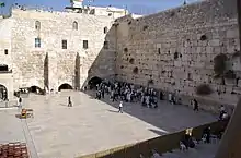 ![]() حائط البراق يُعتبر من أشهر معالم مدينة القدس، ولهذا الحائط مكانة كبيرة عند أتباع الديانتين الإسلامية واليهودية. |