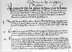 في عام 1490، نص تشارلز الثامن بأمر من مولين على أن لغة الولاية القضائية ستكون من الآن فصاعدًا " اللغة الأم أو الفرنسية" وليس الاتينية. سيتم تأكيد هذا الحكم بمرسوم لويس الثاني عشر في يونيو 1510 [17] :