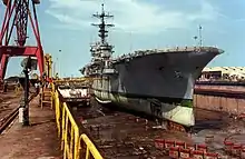 سفينة USS Tripoli (LPH-10) في رصيف جاف للإصلاح في الشركة العربية لبناء السفن وإصلاح السفن (دبي) لإصلاح فتحة في قوسها الأيمن بسبب لغم عراقي، 1991.