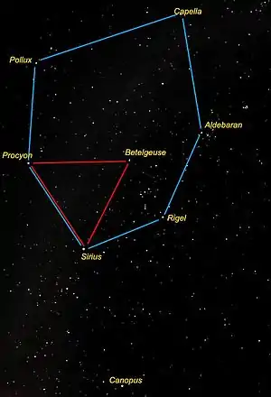 ويكوّن مع نجوم من ضمنها الشعرى اليمانية ومنكب الجوزاء ما يسمى مسدس الشتاء.