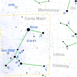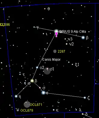 | Dog Star, Aschere, Canicula, Al Shira, Sothis,[17] Alhabor,[18] Mrgavyadha, Lubdhaka,[19] Tenrōsei,[20] α Canis Majoris (α CMa), 9 Canis Majoris (9 CMa), HD 48915, HR 2491, BD−16°1591, GJ 244, LHS 219, ADS 5423, LTT 2638, هيباركوس 32349[21] | |