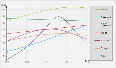 السنة الشعرى اليمانية سهيل[؟] النسر الواقع السماك الرامح الشعرى الشامية النسر الطائر رجل القنطور −100.000 −0,66 −0,82 +0,33 +0,88 +0,88 +1,69 +2,27 −75.000 −0,86 −0,80 +0,24 +0,58 +0,73 +1,49 +1,84 −50.000 −1,06 −0,77 +0,17 +0,30 +0,58 +1,27 +1,30 −25.000 −1,22 −0,75 +0,08 +0,08 +0,46 +1,03 +0,63 0 −1,43 −0,72 0,00 −0,02 +0,37 +0,78 −0,21 25.000 −1,58 −0,69 −0,08 +0,02 +0,33 +0,49 −0,90 50.000 −1,66 −0,67 −0,16 +0,19 +0,32 +0,22 −0,56 75.000 −1,66 −0,65 −0,25 +0,45 +0,37 −0,06 +0,30 100.000 −1,61 −0,62 −0,32 +0,74 +0,46 −0,31 +1,05