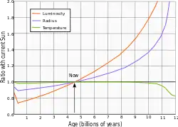 في المستقبل، سوف يستمر الهيليوم في التراكم في قلب الشمس، وفي حوالي 5 مليارات سنة ستؤدي هذه الزيادة التدريجية في النهاية إلى خروج الشمس من التسلسل الرئيسي وتصبح عملاقًا أحمر.[48]