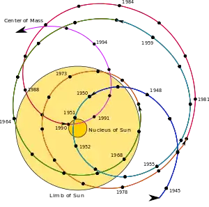 | الميل المحوري | 7.25°[1] (من مسار الشمس) 67.23° (to the مستوي المجرة) |