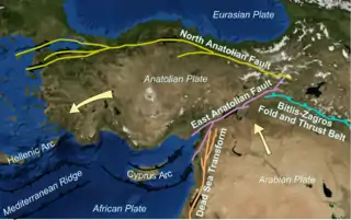 تشير الأبحاث إلى أن الصفيحة الأناضولية تدور بعكس اتجاه عقارب الساعة حيث يتم دفعها غربًا بواسطة الصفيحة العربية، معيقةً أي حركة شمالية من الصفيحة الأوراسية. [3] في بعض المراجع، يشار إلى الصفيحة الأناضولية على أنها "كتلة" من القشرة القارية التي لا تزال مقرونة بالصفيحة الأوراسية. لكن دراسات فالق شمال الأناضول تشير إلى أن الأناضولية تنفصل عن الصفيحة الأوراسية. يتم الضغط عليه الآن من قبل الصفيحة العربية من الشرق وتجبرها على الحركة في اتجاه الغرب حيث أن الصفيحة الأوراسية في الشمال تمنع الحركة في هذا الاتجاه. تندس الصفيحة الإفريقية تحت صفيحة الأناضول على طول قبرص والأقواس اليونانية في البحر الأبيض المتوسط.
