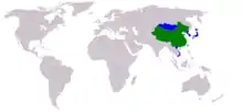 الصين العظمى، المناطق باللون الأخضر الداكن تمثل المناطق الصينية، المناطق باللون الأخضر الفاتح تمثل مناطق متأثرة بالثقافة الصينية.