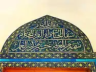 باب الضريح مُزخرف ببلاطات إزنيق بأنماط زهرية باللون الأزرق والأبيض والأصفر.