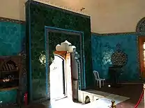 الجدران الداخلية للضريح نصفها السفلي مَكسُوّ ببلاطات سُداسية الشكل خضراء وزرقاء.