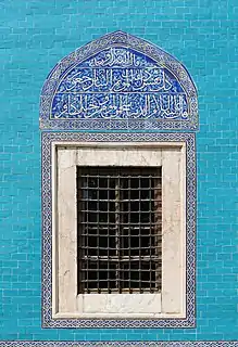 النوافذ مُزخرفة من الخارج بآيات من القرآن الكريم على بلاطات الخزف الصيني، بينما الزخرفة الداخلية للنوافذ فهي بأحاديث النبي