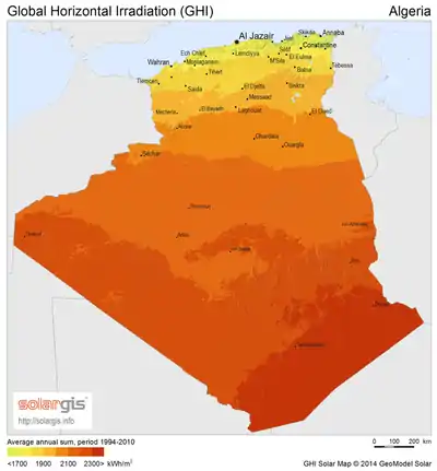 بالإضافة إلى ذلك، شرعت الجزائر في عام 2011 في البدء بتطوير برنامج للطاقة المتجددة كالخلايا الشمسية (PV)، الطاقة الشمسية المركزة (CSP)، طاقة الرياح. يهدف البرنامج إلى تثبيت 12 جيجاوات من الطاقة بحلول عام 2030.[11]