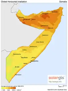 تمتاز أغلب دول أفريقيا بارتفاع معدل الإشعاع الشمسي السنوي لها، خاصة في المناطق الجافة كالصحاري (مثل الصحراء الكبرى) والسهول (مثل منطقة الساحل).[9] مما يتيح للحكومات إنشاء المزارع الشمسية في أغلب المناطق دون الحاجة إلى استخدام تكنولوجيات متطورة لتركيز وتجميع الأشعة الشمسية. تتقارب معدلات سقوط الأشعة الشمسية في دول أفريقيا بنسبة كبيرة تصل إلى حوالي 85٪ لتستقبل حوالي 2000 كيلو وات ساعة/ متر مربع في العام الواحد.