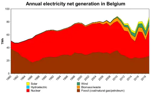 توجد أغلب السعة الكهربائية في الإقليم الفلامندي حوالي 88٪، بينما يتواجد الباقي بنسبة 12٪ في إقليم والونيا. أما العاصمة بروكسل فوصل توليد الكهرباء بها إلى 7 ميجاوات في نهاية عام 2011.[9]