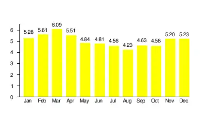 ![]() يصل معدل الإشعاع الشمسي في بانكوك لليوم الواحد إلى حوالي 5.4 ساعة.[7][8] |