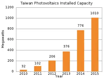 يوضح الجدول الأتي تطور السعة الكهربية للطاقة الشمسية في تايوان في السنوات الأخيرة.[6]
