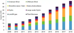 وقد بلغت مساهمة الطاقة المتجددة في تحقيق خفض بنسبة 15٪ في إجمالي استهلاك الطاقة في المملكة المتحدة بحلول عام 2020 وفقا لتوجيه الاتحاد الأوروبي للطاقة المتجددة لعام 2009 بلغ إجماليها 5.2٪ في عام 2013 وفقا للمنهجية المبينة في التوجيه.[2] وبحلول عام 2016 تظهر الحسابات المؤقتة أن الرقم ارتفع مرة أخرى إلى 8.3 في المائة من استهلاك الطاقة الواردة من مصادر متجددة في عام 2015.[4]