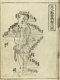 يقول الطب الصيني التقليدي "إن الطاقة الحيوية للجسم ( تشي ) (chi أو qi) تنتشر عبر قنوات تسمى خطوط الطول ، والتي لها فروع متصلة بأعضاء ووظائف الجسم." [7] لا تهتم نظرتها لجسم الإنسان إلا بشكل هامشي بالتركيبات التشريحية، ولكنها تركز بشكل أساسي على وظائف الجسم [48][49] (مثل الهضم، والتنفس، والحفاظ على درجة الحرارة، إلخ. ):
