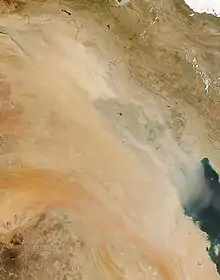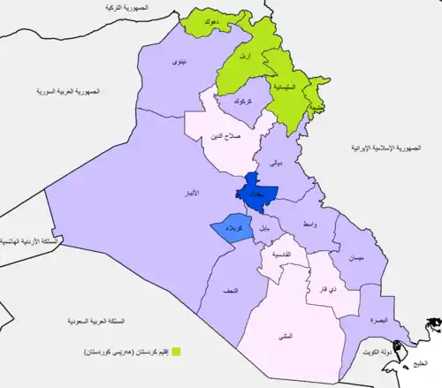 العِرَاقُ[27] رسمِيّاً جُمْهُوريَّة العِرَاق[28] (بالكردية: كۆماری عێراق)[29] دولة عربية، وتعد جمهورية برلمانية اتحادية وفقاً لدستور العراق، [30] وتتكون من ثمانية عشر محافظة رسمياً، وتسعة عشر محافظة بحكم الأمر الواقع (المحافظة التاسعة عشر هي محافظة حلبجة)، عاصمته بغداد. تقع في غرب آسيا[31] مطلة على الخليج العربي. يحده من الجنوب الكويت و المملكة العربية السعودية[32]، ومن الشمال تركيا[33]، ومن الغرب سوريا والأردن[34]، ومن الشرق إيران، وهو عضو مؤسس في جامعة الدول العربية[35] ومنظمة المؤتمر الإسلامي[36] ومنظمة أوبك. معظم أراضي الدولة حاليًا تقع في منطقة بلاد الرافدين، وحوى المنطقة على أولى المراكز الحضارية في العالم التي كانت تقع بين نهري دجلة و الفرات وهي حضارة سومر، وامتدت حدود هذه الحضارة التي شغلتها بلاد الرافدين إلى سوريا وبلاد فارس وإلى منطقة جنوب شرق الأناضول تركيا حالياً، كما وجدت آثار سومرية في دولة الكويت الحالية[37] والبحرين[38][39] و الأحواز بإيران. كان لبلاد الرافدين انفتاح واتصال بالحضارات القديمة في مصر و الهند.[40] وتعاقب على حكم العراق دول وحضارات كثيرة من أهمها السومرية، و البابلية الحديثة، و الآشورية، و الميديون، و السلوقيون، و الإمبراطورية البارثية، و الإمبراطورية الرومانية، و الساسانيون، و المناذرة، و الخلافة الراشدة، و الدولة الأموية، و الدولة العباسية، و المغول، و الدولة الصفوية، و الدولة الأفشارية، و الدولة العثمانية، ثم الانتداب البريطاني، ومن ثم المملكة العراقية، ثم الجمهورية، ثم سلطة الأورها (إعادة إعمار العراق[41])، فسلطة الائتلاف المؤقتة، فالحكومة العراقية المؤقتة، ثم الجمهورية البرلمانية الاتحادية في العراق.
