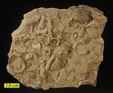 فينالدوستروفيا بونديروس (Vinlandostrophia ponderosa) من الأوردوفيشي العلوي بالقرب من ماديسون، إنديانا. المقياس 5.0 مم.