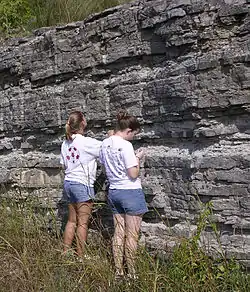 نتوء من الأوردوفيشي العلوي لحجر جيري وطفل، جنوب إنديانا؛ طلاب كلية ووستر.