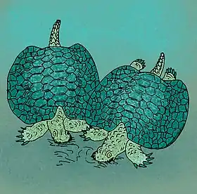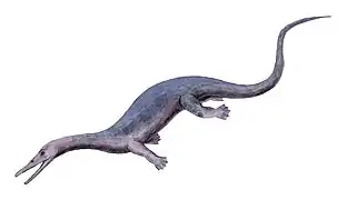 - مقسومات الفقار: تعد واحدة من أكبر المجموعات البرمائيات الأولية، وقد نشأت خلال العصر الفحمي، كانت لا تزال كبيرة الحجم. عندما كثرت في البيئات الأرضية والمائية، لم تلبث حتى حلت الزواحف محل أغلب الأنواع الأرضية. وكانت الناجية من العصر الثلاثي مائية أو شبه مائية، ومنها التوبيلاكوصور [الإنجليزية]، والتابانشيا [الإنجليزية]، والعظاءات الخيشومية [الإنجليزية]، ودقيقة الحراشف [الإنجليزية] والتي جميعها ماتت في الثلاثي المبكر، ومجسمات الفقار المتفوقة نجت مع الناجين في العصر الطباشيري. وأكبرها عظاءة السن الثدييية [الإنجليزية] التي يصل طولها من 4 إلى 6 أمتار.