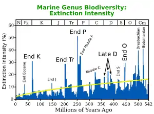 تسبب انقراض البرمي الثلاثي في دمار الحياة الأرضية. لكن التنوع البيولوجي انتعش، فقد عاشت الأنواع الباقية في الأراضي الفارغة، لكن كانت أعمارها قصيرة. واستغرقت المجتمعات المتنوعة ذات الشبكة الغذائية المعقدة حوالي 30 مليون سنة لتعود من جديد.[10]