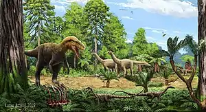 الجوراسي أو الجوراوي (باللاتينية: Jurassic)، وهو ثاني العصور الثلاثة من حقبة الحياة الوسطى ودهر البشائر، امتد من 201.3 ± 0.2 إلى≈ 145 مليون سنة مضت، لمدة 56.3 مليون سنة تقريبا[5][6].[note 1] يسبقه الثلاثي، ويليه الطباشيري. يُعرف الجوراسي بعصر الزواحف. تميزت بدايته بحدث انقراض الثلاثي-الجوراسي. وهناك حدثان آخران للانقراض خلال هذا العصر: انقراض البلنسباخي-التورسي في الجوراسي المبكر، وحدث التيثوني في النهاية؛[9] ولا يصنف كلا الحدثين من ضمن الانقراضات الجماعية "الخمسة الكبار". في بداية الجوراسي، بدأت القارة العظمى بانجيا بالانقسام إلى كتلتين أرضيتين: لوراسيا شمالا، وغندوانا جنوبا. وقد خلقت المزيد من السواحل وتحول المناخ القاري من الجاف إلى رطب، وتبدل العديد من الصحاري القاحلة من العصر الثلاثي إلى غابات مطيرة مورقة.