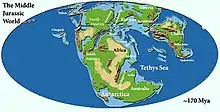 انقسمت قارة بانجيا الكبرى خلال فترة الجوراسي المبكر إلى قارتين مستقلتين لوراسيا الشمالية وغندوانا الجنوبية؛ وانفتح خليج المكسيك في الصدع الجديد بين أمريكا الشمالية وما يطلق عليها الآن بشبه جزيرة يوكاتان في المكسيك. كان المحيط الأطلسي الجوراسي الشمالي ضيّقاً نسبياً، بينما المحيط الأطلسي الجنوبي لم ينفتح حتى العصر الطباشيري التالي، عندما تفككت غندوانا.[18] انغلق بحر تيثس، وظهر بحر تيثس الجديد (حوض البحر الأبيض المتوسط)، وكان المناخ دافئاً، وعدم وجود أية أدلة على حدوث تجلد. وكما هي الحال في العصر الثلاثي، لم كن هناك أية يابسة بالقرب من القطبين، ولا غطاء جليدي.