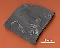 أحافير من قاع البحر السيلوري تم جمعها من محمية ويرن نست الطبيعية، في دودلي المملكة المتحدة.