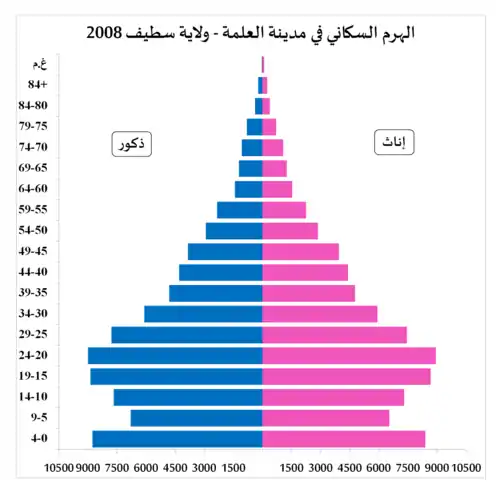 يُظهر هرم سكان العلمة خلال إحصائيات 2008 أن النسبة الأكبر من السكان هي من الشباب حيث 69.79 % أقل من 34 سنة و40.64 % أقل من 19 سنة، في الأسفل هرم سكان العلمة عام 2008 حسب بيانات إحصائيات السكان للديوان الوطني للإحصاء.[4]