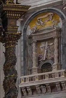على اليمين ، اثنان من الأعمدة السليمانية جلبت إلى روما من قبل قسطنطين، في موقعهما الحالي على رصيف في كاتدرائية القديس بطرس . في المقدمة على اليسار هو جزء من بلادكينو برنيني، المستوحاة من الأعمدة الأصلية.