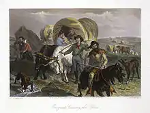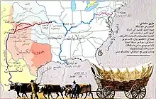 للوصول إلى الأراضي الجديدة الغنية في الساحل الغربي كان هناك خياران: البعض أبحر حول الطرف الجنوبي لأمريكا الجنوبية في رحلة استغرقت سنة أشهر، ولكن هناك 400,000 آخرون ساروا على طريق بري لأكثر من 2,000 ميل (3,000 كم)؛ وقد غادرت أغلب عربات قطارتهم من ميزوري، وانتقلوا في مجموعات كبيرة تحت قيادة مُشرف عربات خبير، جالبين ملابسهم ولوازم الزراعة والأسلحة والحيوانات. قطارات العربات هذه كانت تتبع الأنهار الرئيسية عبر المروج والجبال، وكانت تنتهي عادةً في أوريجون وكاليفورنيا. وقد حاول الرواد عمومًا إكمال الرحلة خلال موسم دافئ واحد، عادةً على مدار ستة أشهر. وبحلول سنة 1836 عندما تم تنظيم أول قطار عربات للمهاجرين في إندپيندنس بميزوري، تم تمهيد مسلك العربات إلى فورت هول بإيداهو. ثم تم تمهيد مسالك أكثر بُعدًا باتجاه الغرب، وصولًا في النهاية إلى وادي ويلامات في أوريجون. وهذه الشبكة من مسالك العربات التي تؤدي إلى شمال غرب المحيط الهادئ سُمْيَّت فيما بعد بمسلك أوريجون. النصف الشرقي من المسار تم استخدامه أيضًا من قِبل المسافرين على مسلك كاليفورنيا (ابتداءً من عام 1843)، ومسلك المورمون (ابتداءً من عام 1847)، ومسلك بوزمان (ابتداءً من عام 1863) قبل أن يخرجوا منه إلى وجهاتهم المنفصلة.[95]