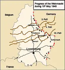 في الساعة 04:35 بدأ الغزو الألماني عندما عبرت فرق البانزر الأولى والثانية والعاشرة الحدود في فاليندروف-بونت، وفياندن، وإيخترناخ على التوالي.[22] مستخدمةً المنحدرات الخشبية لعبور فخاخ الدبابات لخط شوستر.[11] جرى تبادل إطلاق النار، لكن الألمان لم يواجهوا أي مقاومة تذكر باستثناء بعض الجسور التي دمُرت وبعض الألغام الأرضية، لاسيما أن أغلب فرق المتطوعين بقت في ثكناتها. أما من دافع عن الحدود فهم الجنود الذين تطوعوا لواجب الحراسة وقوات الدرك فقط.أمَنَت مجموعة من الألمان الجسر في فورميلدنج وقبضت على ضابطي الجمارك هناك، اللذان طالبوهما بالتوقف لكنهما امتنعا عن إطلاق النار.[13] اصلح مهندسون من كتيبة غروس دويتشلاند الجسر المهدم جزئيا بسرعة فوق نهر سوير في ايخترناخ، مما سمح بعبور فرقة البانزر العاشرة، وحلقت الطائرات أعلاهم مُتجهة صوب بلجيكا وفرنسا، على الرغم من أن بعض القوات توقفت وهبطت داخل البلاد.[بحاجة لمصدر]
