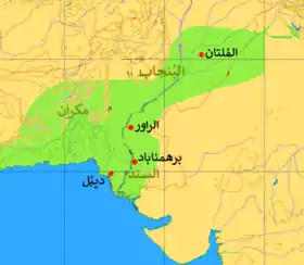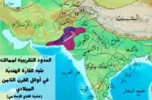 ![]() خريطة تُصوِّرُ أقصى ما بلغته الفُتُوحات الإسلاميَّة بِقيادة مُحمَّد بن القاسم في شمال غرب الهند حوالي سنة 711م. | |||||||