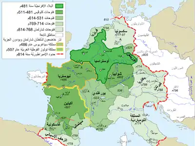 كانت مملكة الإفرنج قد قامت وثبَّتت أركانها على يد أميرٍ شُجاعٍ مقدامٍ يُدعى «كلوڤيس» كان يتزعَّم إحدى فُروع القبائل الجرمانيَّة التي استقرَّت مُنذُ أواخر القرن الخامس الميلادي، بين نهر الرَّاين وبحر الشمال في إقليم الفلمنك وما إليه، ثُمَّ على ضفاف الرَّاين الوُسطى والموزل.[1] وكان كلوڤيس المذكور قد فتح شمال فرنسا المُعاصرة سنة 486م مُنتزعًا إيَّاه من آخر الوُلاة الرومان الذي كان قد أقام به دولة مُستقلَّة بُعيد انهيار الإمبراطوريَّة الرومانيَّة الغربيَّة، ثُمَّ حارب القبائل الألمانيَّة القاطنة شرق نهر الرَّاين، وافتتح أراضيها حتَّى باڤاريا. وفي سنة 507م حارب كلوڤيس القوط، وكانوا قد استقرُّوا في الغال (القسم الجنوبي من فرنسا) وقتل ملكهم ألاريك الثاني،[ْ 4] واستولى على الأراضي الواقعة ما بين نهر اللوار وجبال البرتات، عدا ولاية سپتمانية التي بقيت في يد القوط. وهكذا أرسى كلوڤيس قواعد دولته الكبيرة، وجعلها مملكةً عُظمى تربَّع هو على عرشها لِيكون أوَّل مُلوك الإفرنج عامَّةً ومُؤسس الأُسرة الميروڤنجيَّة، واتخذ تخت مُلكه في مدينة بريش (باريس)، فأصبحت عاصمة بلاد الفرنجة مُنذ ذلك الحين.[2] تابع أبناء كلوڤيس وخُلفاؤه من بعده سياسة الفتح، وافتتحوا بورغندية وأواسط جرمانية وشمالي شبه الجزيرة الإيطاليَّة. ثُمَّ وقعت الحرب الأهليَّة حينًا بين أُمراء الإفرنج الذين اقتسموا تُراث كلوڤيس، حتى جاء كلوتير الثاني سنة 613م فبسط سُلطانه على الغال كُلها، واستأنف الفتح لإخضاع باقي الإمارات الإفرنجيَّة الواقعة شرقيَّ الرَّاين. وسار ولده داگوبرت في أثره، وجمع كلمة الفرنجة تحت لواءٍ واحدٍ، وغلبت سلطة الإفرنج على جرمانية الغربيَّة ثانيةً.[2] كان داگوبرت آخر المُلوك الميروڤنجيين الذي استطاع أن يقبض على زمام السُلطة المركزيَّة بِيدٍ قويَّة،[ْ 5] أمَّا خُلفاءه فكانوا رجالًا ضِعاف الخِلال والعزائم، مُنغمسين في الترف والملذَّات، فضعُف سُلطان العرش، وانهارت السُلطة المركزيَّة القويَّة التي كان يقبض عليها ملكُ الفرنجة، واستقلَّ الأشراف والزُعماء المحليُّون وأصبح كُلٌ منهم الآمر الناهي في إقطاعه، ولا يرتبط بِالسُلطة المركزيَّة في بريش إلَّا إسميًّا.[3]