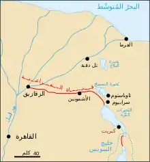 ![]() خريطة تُظهرُ زحف المُسلمين نحو مصر آتين من الشَّام والحجاز | |||||||