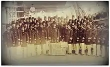 في وسط الصورة "أمير لواء" (لواء بحري) (بالتركية: Mirliva) "علي عثمان باشا" قائد رحلتها الدبلوماسية إلى اليابان عام 1890م.