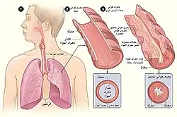 ![]() يوضح الشكل (1) موقع الرئتين والمسالك الهوائية في الجسم. يوضح الشكل (2) مقطعًا عرضيًا في مجرى الهواء الطبيعي. يوضح الشكل (3) مقطعًا عرضيًا في مجرى الهواء أثناء أعراض الربو. يوضح الشكل (1) موقع الرئتين والمسالك الهوائية في الجسم. يوضح الشكل (2) مقطعًا عرضيًا في مجرى الهواء الطبيعي. يوضح الشكل (3) مقطعًا عرضيًا في مجرى الهواء أثناء أعراض الربو. | |